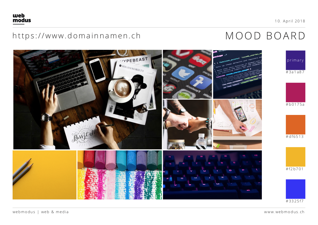 Nützliche Hilfsmittel bei diesem Schritt sind dabei ein Moodboard, mit dem die allgemeine Stimmung und Farbgebung der Website ausgedrückt werden, und ein Wireframe, gewissermassen das Gerüst oder der Grundriss der späteren Website.
